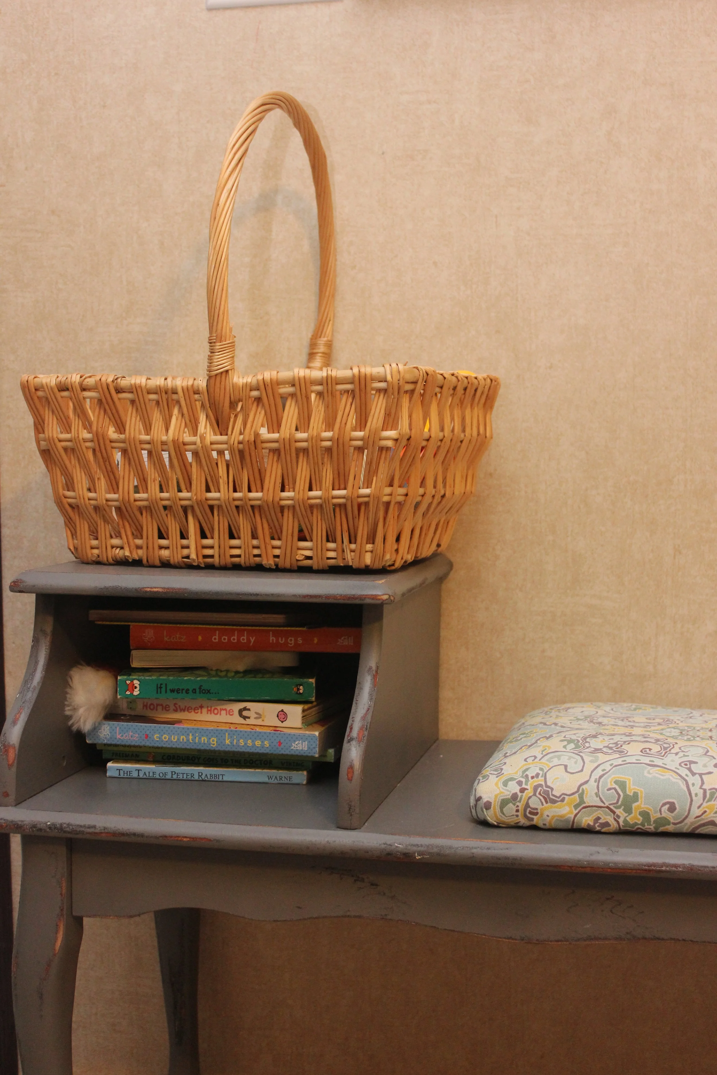 Reading Nooks. I say reading nooks because we literally have reading nooks all over. For the majority of our children's books, we house them on a simple white bookshelf down our hallway so both children can access them. From there, each child has their own section on a self, on the floor, where they can sit and read books in their room. Then our TeePee that is both for the kids and my love of boho decor, is in the living room with a basket of books and reading pillows in it. Lastly, we have an old thrifted phone bench that serves as a reading nook as well. I believe in keeping books all over to allow them to be easily accessible and to seem "important" in a child's eyes.