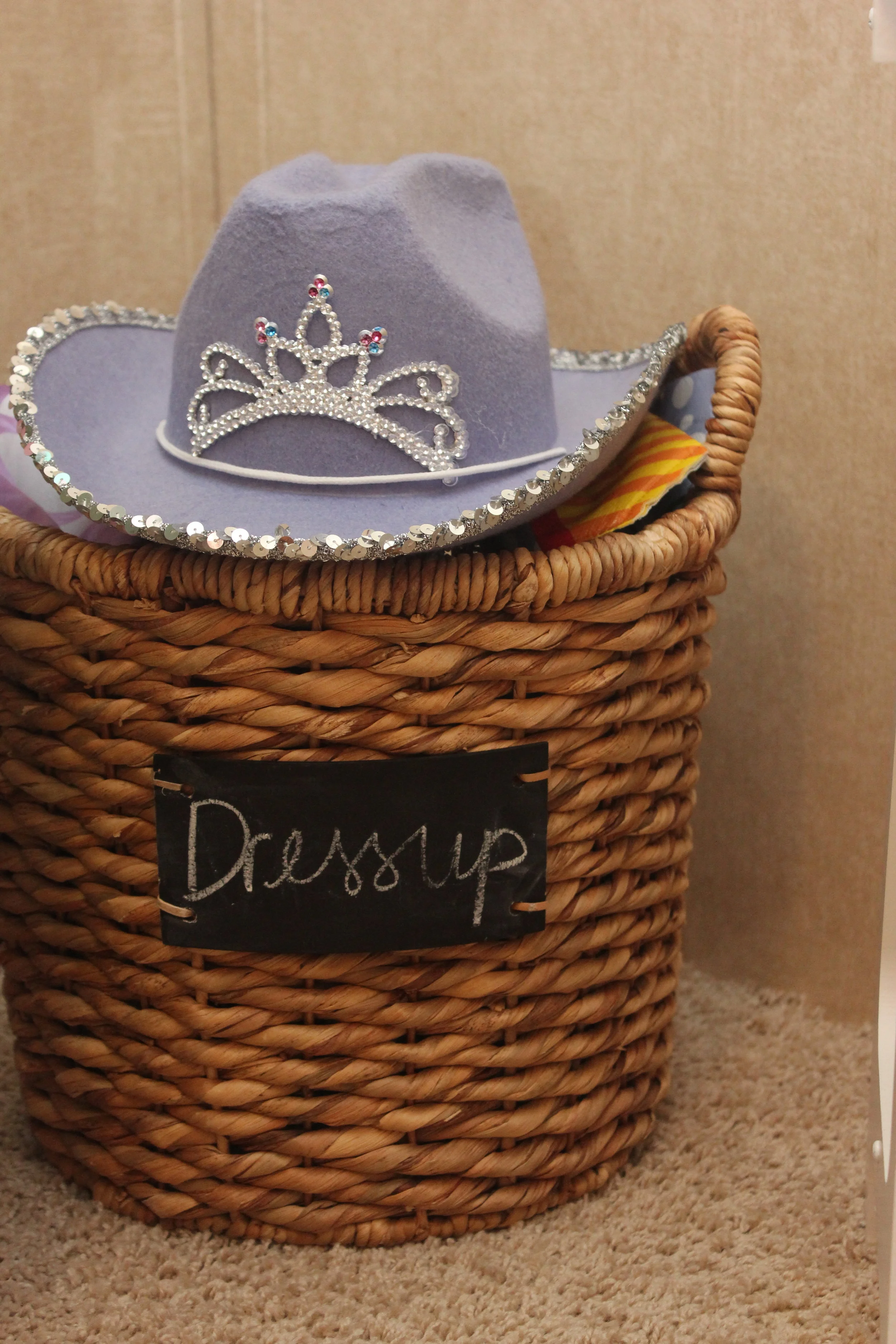Fabric Bins. We no longer have any fabric toy bins, but I love a good burlap bin or even a wicker bin (which we do have) for catch alls around the home. A catchall bin is great in the living room to pick up messes in a hurry for company. Bins are also wonderful for dressup as we have here! They can also be great for soft animals and doll storage.