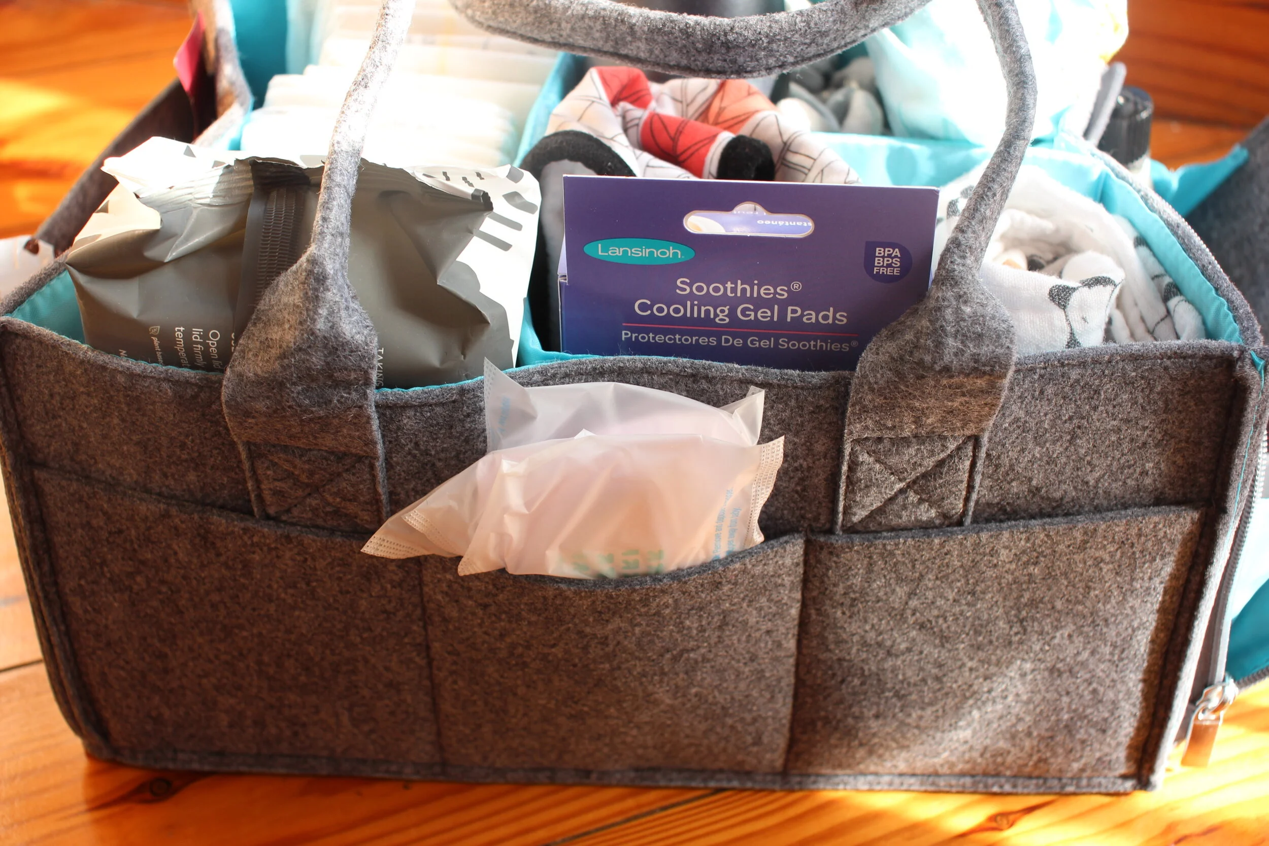 One thing that I have done for my last couple of babies that has helped tremendously is to have a well stocked and organized basket or caddy nearby for our postpartum period. I find that by having this setup I don’t have to get up as much or request my husband to go digging for something that he may not know exactly where it’s at (ya know, men). A good, organized caddy will be so helpful to any and all mamas to have on hand. It’s definitely a must have for mothers recovering from a surgical birth or who may find themselves in a position where they can’t be as mobile as they had planned to be.
